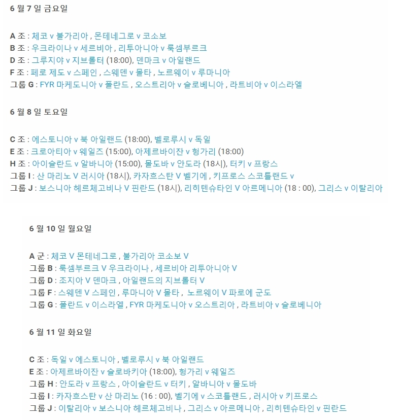 6월달 부터 진행되는 유로 2020본선 경기 중계 일정입니다. 추후 9월, 10월, 11월 일정도 포스팅 하겠습니다.