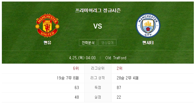 맨유는 4위 진입, 맨시티는 리그 우승을 위해서 반드시 이번 경기를 잡아야 한다. 또한 라이벌 경기이기에 양 팀 모두 총력전으로 나설 것으로 보인다. 상황이 이렇다 보니 ‘맨유의 라이벌’ 리버풀이 맨유를 응원하는 해프닝도 발생하고 있다. 리버풀이 맨시티를 제치고 자력으로 우승하기 위해선 맨유의 승리가 필요하기 때문이다.