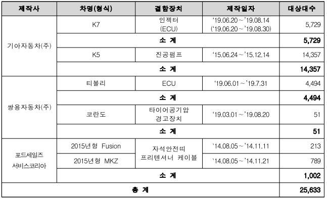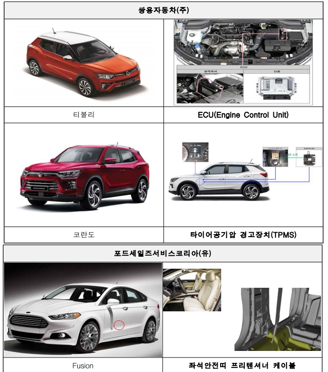 쌍용자동차에서 제작하여 판매하는 티볼리 차량의경우 정차 후 출발시 비정상적인 신호로 점화시기가 지연되어 출발지연 현상 등이 발생하여 안전운행에 지장을 줄 가능성이 확인되어 시정 조치에 들어간다. 또한, 코란도의 경우 타이어공기압 경고장치의 안전기준 부적합으로 리콜을 실시하고 안전기준 부적합에 대한 과징금도 부과할 예정이다.