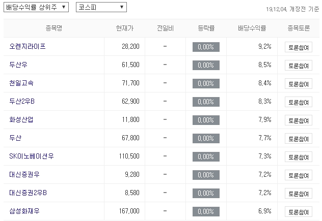 2018년 배당기준으로 코스피 배당1위는 오렌지라이프가 9.2%배당을 하였다. 이론적으로 오렌지 라이프가 지속적으로 같은 금액을 배당한다면 12월에 입성을 하면 1년1개월 투자에 20%에 육박하는 배당금을 받을수 있는것이다.
