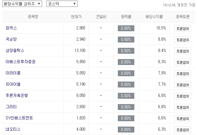 코스닥에서는 파커스라는 회사가 10.5%, 국순당이 8.8%의 배당을 하여 1위와 2위를 차지하였다. 현재의 은행예금금리가 12개월 기준으로 2%가 채 되지 않는점을 감안한다면 상당히 높은 수치이다.
