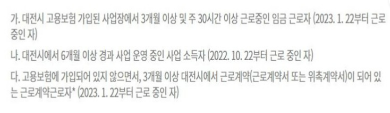 3. 고용 보험에 가입되어 있지 않으면서 3개월이상 대전시에서 근로계약(근로계약서 또는 위촉계약서)이 되어 있는 근로계약근로자(2023.01.22 부터 근로 중인자)