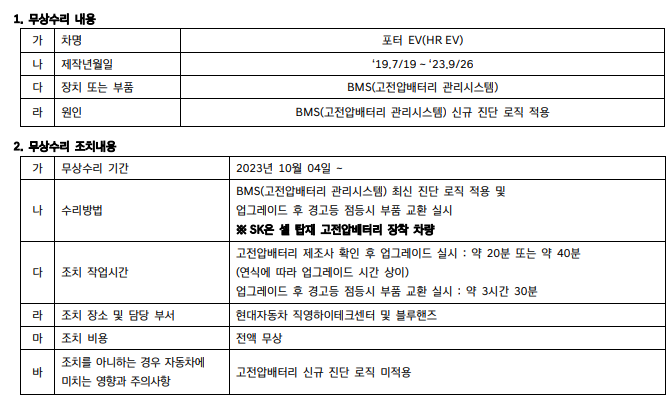 SK온 셀이 탑재된 포터 EV에 대한 무상수리 소식입니다.