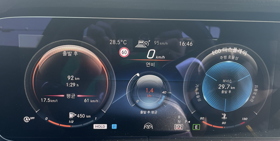100km 크루즈 걸고 반자율 주행을 하면 17km/l 연비를 보여 준다. 고속도로 연비는 생각보다 훨씬 좋은 편이다. 그랜져 IG나 G80을 운전했을 때 절대로 볼 수 없는 수치이다.