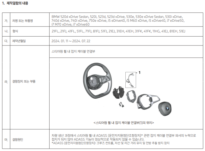 BMW의 아래 표시된 모델에 대해 스티어링 휠 내 접지 케이블 연결부 체결 불량으로 인한 리콜을 실시한다.