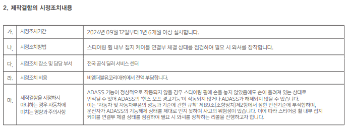 해당 차량의 연식은 2024.01.11 ~ 2024. 07. 22 생산 차량으로 차량 생산 과정에서 스티어링 휠 내 ADASS [운전자지원첨단조향장치] 관련 접지 케이블 연결부 와셔의 누락으로 접지가 되지 않아 ADASS 기능이 정상적으로 작동되지 않을 수 있으며, 이런 경우 스티어링 휠에 손을 놓지 않았음에도 손이 올려져 있는 상태로 인식될 수 있어 ADASS의 '핸즈 오프 경고기능'이 작동되지 않거나 ADASS가 해제되지 않을 수 있는 가능성에 따른 리콜 (이는 '자동차 및 자동차부품의 성능과 기준에 관한 규칙' 제89조(조향장치)제2항에서 정한 안전기준에 부적합하며, 운전자가 ADASS의 기능 해제 상태를 제대로 인지하지 못하여 사고의 위험성이 있음)