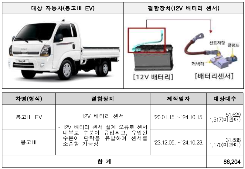 현대 자동차는 포터 EV모델의 12V 배터리 설계 오류로