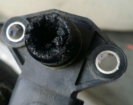 흡기매니폴더 안에서 압력을 측정하다 보니 센서 입구가 카본에 의해 막힐 수 밖에 없는 구조이다. 이렇게 센서가 막히다 보니 흡입공기의 압력을 제대로 EMS전달이 되지 않은 모양이다.