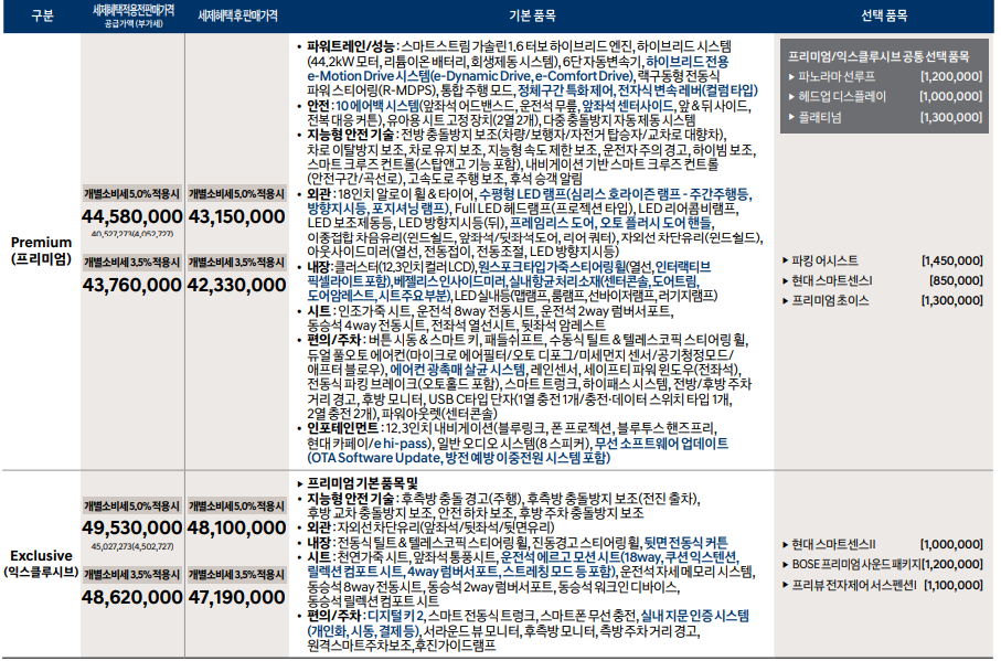 물론 옵션의 차이는 있겠지만 기본적으로 1.6터보에 하이브리드