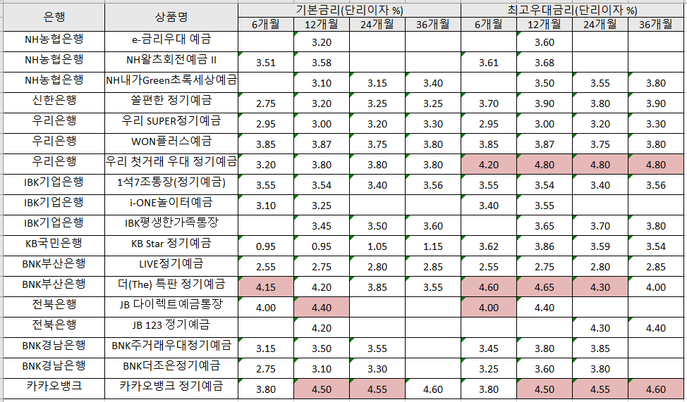 우대 금리적용시 BNK부산은행과 우리은행 상품이 좀 더 유리한 조건이다.